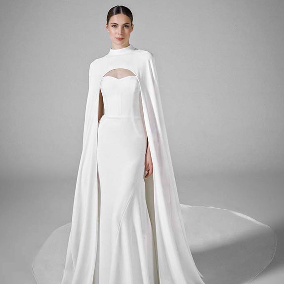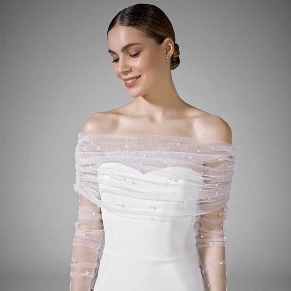 Robe de mariée longue coupe sirène, encolure bateau et manches courtes